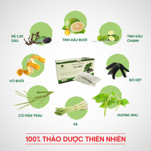 Thành phần: Bồ kết, Hương Nhu, Vỏ bưởi, Mần trầu, Trà xanh, Tinh dầu sả chanh,…